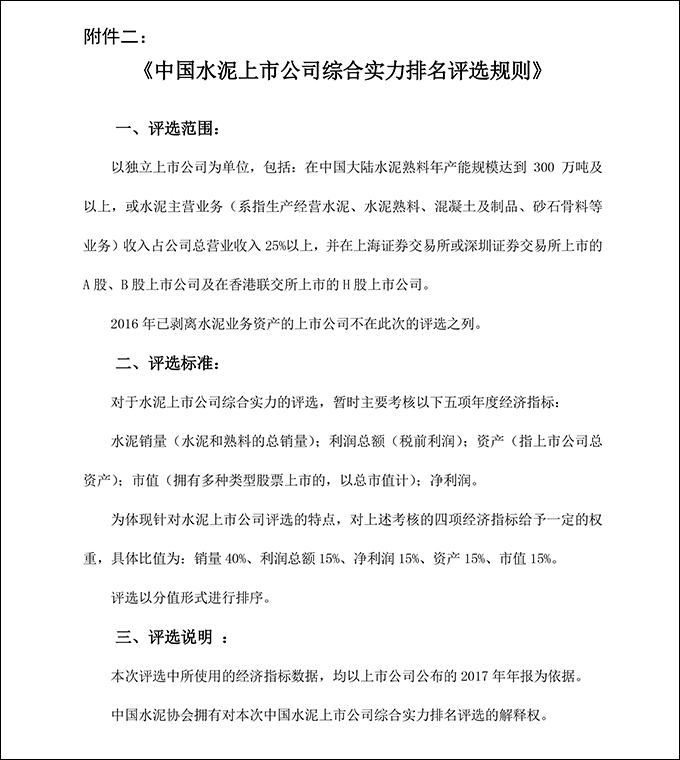 为展示中国水泥行业上市公司的竞争实力,鼓励水泥企业做优做强,培育具有国际竞争力和影响力的龙头企业,推动水泥行业健康持续发展,中国水泥协会本着公开、公正、科学的原则,组织业内专家、证券金融界的专家,共同进行了论证评选。今年综合实力的评选指标包括:水泥销量、利润、市值、资产、净利润。现将2018年中国水泥上市公司综合实力排名结果予以公告。 从2018年中国水泥上市公司综合实力排名结果来看,海螺水泥和中国建材继续以绝对优势保持第1和第2位;金隅集团排名上升1位至第3位;华润水泥控股、华新水泥和冀东水泥依然保持在前十行列,名次略有变动。新进入前十排行的有四家企业,分别是:中国天瑞水泥、亚洲水泥(中国)、西部水泥和塔牌集团,其中,中国天瑞水泥市值大幅提升,净利润也达到了10亿元,排名升至第7位;另外三家企业盈利水平也较为出色,提升最为明显的是西部水泥,净利润同比增长约68倍,排名较去年提升14位。去年排名靠前的企业中,中国中材和台泥国际已经退市,山水水泥暂未发布2017年业绩,中国建材数据中未包含中国中材业绩。(信息来源:中国水泥协会 数字水泥网)