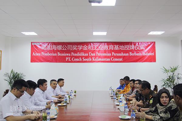 参观期间,县长一行参加了由县政府和南加海螺共同支持设立的“南加海螺奖学金和工业教育基地”授牌仪式。这次授牌是公司践行社会责任,为大巴隆县教育事业做贡献的又一具体举措。授牌仪式上,吴自龙总经理向县长一行介绍了南加海螺发展历程、当前生产经营情况以及海螺在印尼投资发展概况,重点介绍了南加海螺在社会责任履行取得的成绩,并表示公司将持续为建设美好印尼贡献力量。