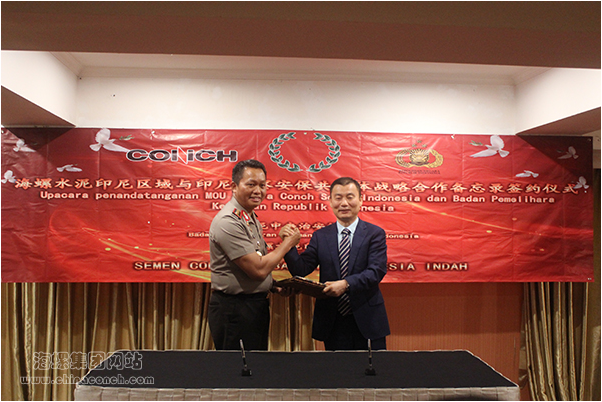 印尼中央治安维护局局长、中将Moechgi yarto,少将Sujarno S.H.,海螺水泥公司副总经理、区域主任柯秋璧,海螺印尼国贸总经理助理王海青等出席签约仪式。柯秋璧和Moechgi yarto中将代表双方在合作备忘录上签字。