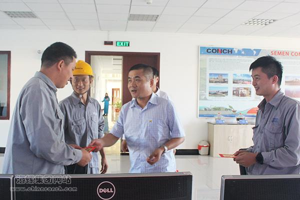 “春节快乐,给大家拜年了!”,在矿山分厂维修车间、发电分厂汽轮机房、制造分厂值班室,装运分厂办公楼前等,陈总与一线员工亲切交谈,了解节日期间生产和值班安排情况,对过去一年来大家为公司生产经营做出的贡献给予充分肯定,对大家付出的辛勤努力表示感谢。陈总还现场慰问了春节期间驻厂单位十七冶,对十七冶公司2019年给予北苏海螺的大力支持表示感谢,双方就节后技改工程收尾工作交换意见,十七冶公司表示节后将加快技改工程收尾,实现早投产、早受益。