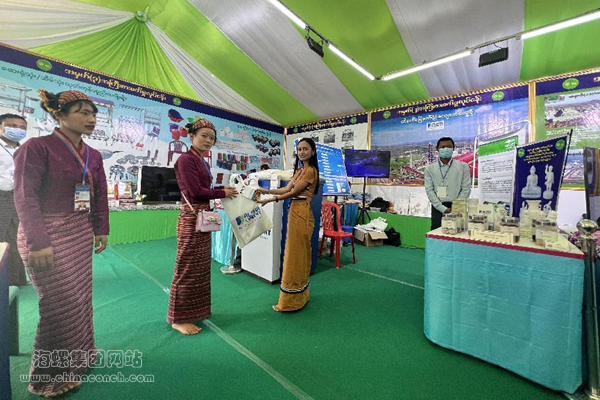 2023年2月10日,第76届缅甸联邦节展会在仰光人民公园举办,一位参加展会的小姑娘正热情洋溢地向同行人员推荐海螺水泥品牌