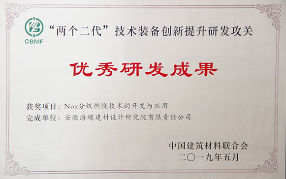 2019年5月,由中国建筑材料联合会主办的“两个二代”技术装备创新提升研发成果汇报会暨总结表彰大会在北京友谊宾馆隆重召开。海螺建材设计院“NOx分级燃烧技术的开发与应用”荣获优秀研发成果奖。海螺新型干法窑低NOx分级燃烧技术自开发实施以来,在100余条水泥熟料生产线上进行了应用,该技术的成功开发和迅速的推广应用,在行业内影响较大,先后在行业期刊发表论文8篇,首条实施项目芜湖海螺4500t/d熟料生产线NOx减排技改工程项目获得建材行业第十次优秀工程设计二等奖,该项目还获得2015年度“宏宇杯”全国建材行业技术革新奖技术开发类一等奖,获得2015年度芜湖市科技进步奖一等奖,共获得3项发明专利和5项实用新型专利。新型干法水泥熟料线进行分级燃烧脱硝技术改造,不仅对降低氮氧化物排放具有稳定良好的效果,对改善环境空气质量有重要意义,而且对水泥熟料生产线的节能降耗和工艺技术起到了很好优化提升的作用,通过对该技术的开发和应用,引领了水泥工业的技术进步,响应国家水泥行业的政策要求,从源头解决了水泥窑炉NOx减排处理问题,提供了一个经济、适用、有效的技术途径,并在促进水泥行业走经济环保节能减排的新型工业化道路上起到很好的示范作用,具有很好的经济效益和环境效益。