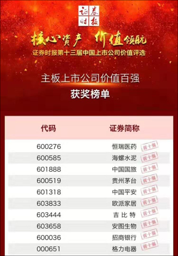 “上市公司价值评选”是中国资本市场极具品牌影响力的价值发现活动之一,经由财务评分体系、机构投票以及专家评审等严格环节,对国内3000多家上市公司2018年度及过去几年在股东回报、盈利能力、财务安全、持续发展、运营效率等方面的表现进行综合评价。在此基础上,挖掘出财务数据优异、治理水平较高、拥有一流管理团队、品牌、战略的优秀上市公司。