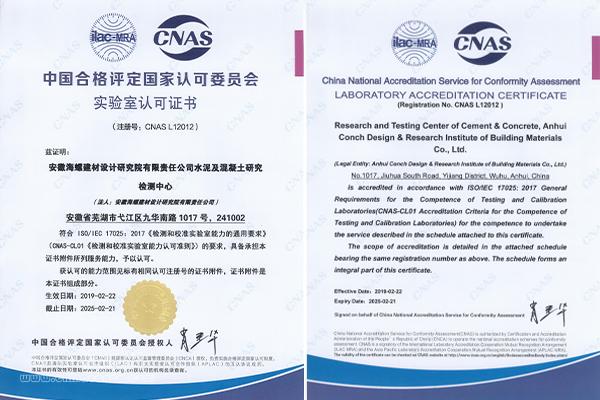 2019年2月22日,海螺集团“水泥及混凝土研究检测中心”获中国合格评定国家认可委员会批准,正式取得CNAS认可资质并授予实验室认可证书,证书编号为L12012。