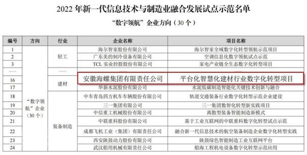 10月31日,工信部公布《2022年新一代信息技术与制造业融合发展试点示范名单》,对具有引领性的标杆示范企业予以表彰,安徽海螺集团成功入选全国首批“数字领航”企业。据悉,本次评选经企业自主申报、地方推进、专家评审等环节,共选出30家“数字领航”企业,涉及轻工、纺织、电子信息、钢铁、有色金属、石化化工、建材、装备制造、汽车共九大领域。