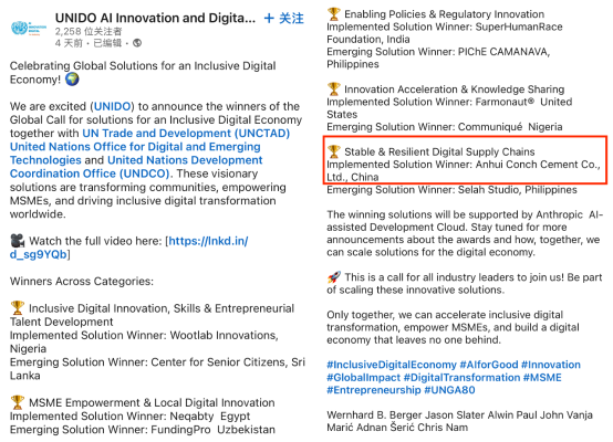近日,海螺集团下属“安徽海螺水泥股份有限公司——海螺云工大模型”在联合国工业发展组织等机构于2025年7月发起的“2025包容性数字经济全球解决方案征集”中,荣获:稳定与韧性的数字供应链 类别 最佳实施方案奖 奖项。