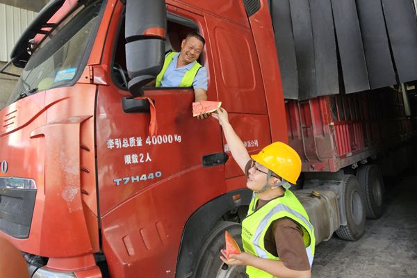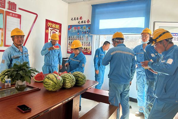 “休息一下,来吃块西瓜解解暑。”送清凉队伍每天在最热时段向生产一线的职工、劳务人员、驾驶员、消防队等送去西瓜、雪糕、饮用水等解暑“秘方”,好不凉爽。