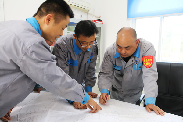 郎益增(右一)与同事研讨绿色矿山创建方案