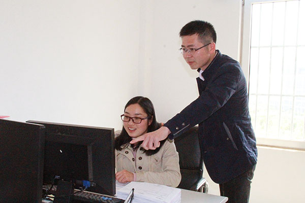 张文韬(右)指导部门员工业务工作