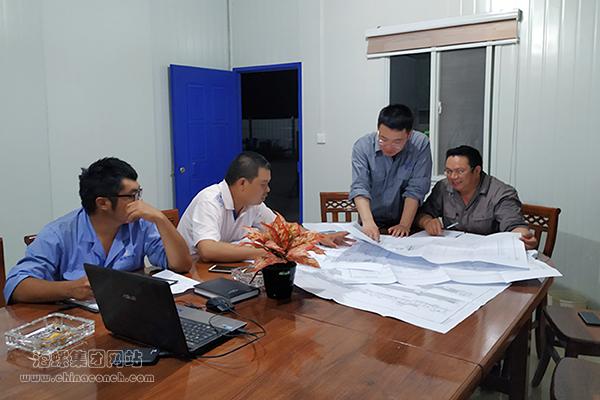 吴磊(右二)与各方一起研究审查项目图纸