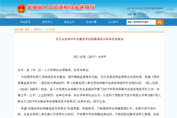近日,从安徽省人力资源和社会保障厅获悉,马鞍山海螺荣获2017年“安徽省劳动保障诚信示范单位”称号,公司已连续两年获此殊荣。