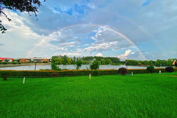 “一曲彩虹横界断,南山雷雨北山晴”。一场雨后,两道彩虹挂在天空,绸缎般的草坪散发出湿润与清新,将海螺的天空装饰得如诗如画,美不胜收。