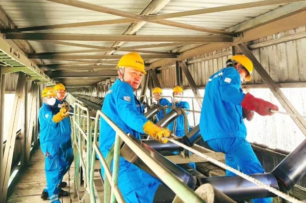 生技处码头工段正在组织更换熟料入库皮带,众人紧握绳子一齐拉住皮带一端,场面热火朝天。