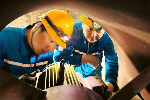 保全工段电气维修工李培培、杨士禹正在对1号磨主电机冷却风机进行检查维护。