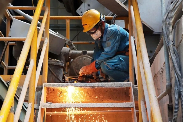 保全工段维巡工王辉正在对码头三号皮带减速机底座进行气割改造。(黄燕 摄)