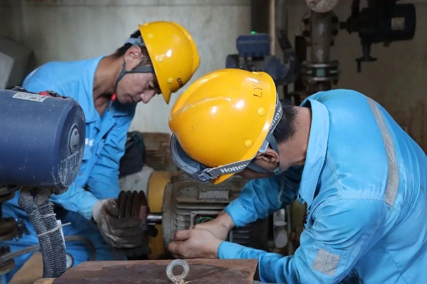 制造二分厂电气工段胡桂明、刘有文正在维护保养脱硫地坑A泵。(陈童 摄)