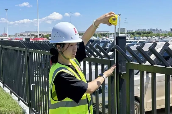 安天利信造价三部周梦华正在肥西新能源汽车智能制造产业园项目测量围墙栏杆高度。(李俊生 摄)