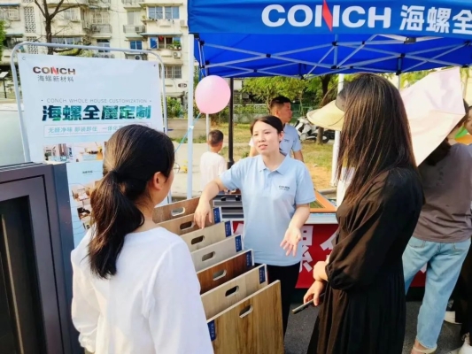 海螺全屋定制首次惠民进社区活动在芜湖市绿影小区开展,工作人员向业主们介绍海螺生态墙板、生态家具、生态地板、系统门窗等产品,现场咨询、登记测量的客户络绎不绝。