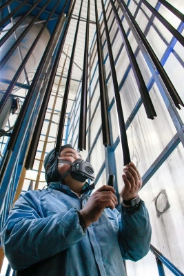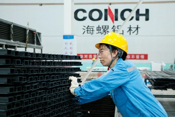 海螺嵩基公司氧化车间员工在对铝型材进行表面喷砂处理。