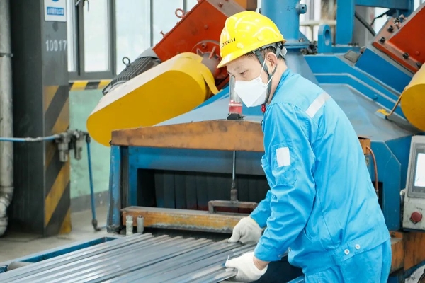 海螺嵩基公司喷涂车间员工在检查喷涂完成的建材有无着色缺陷。(赵龙基 摄)