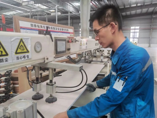 芜湖海螺新材料公司全屋定制加工中心组装工段员工正在进行家具排孔生产。(刘国军 摄)