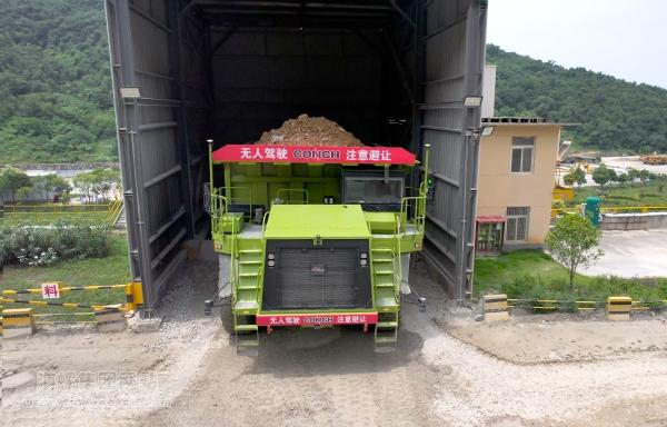 无人驾驶矿车将矿石原料运送到加工车间入口