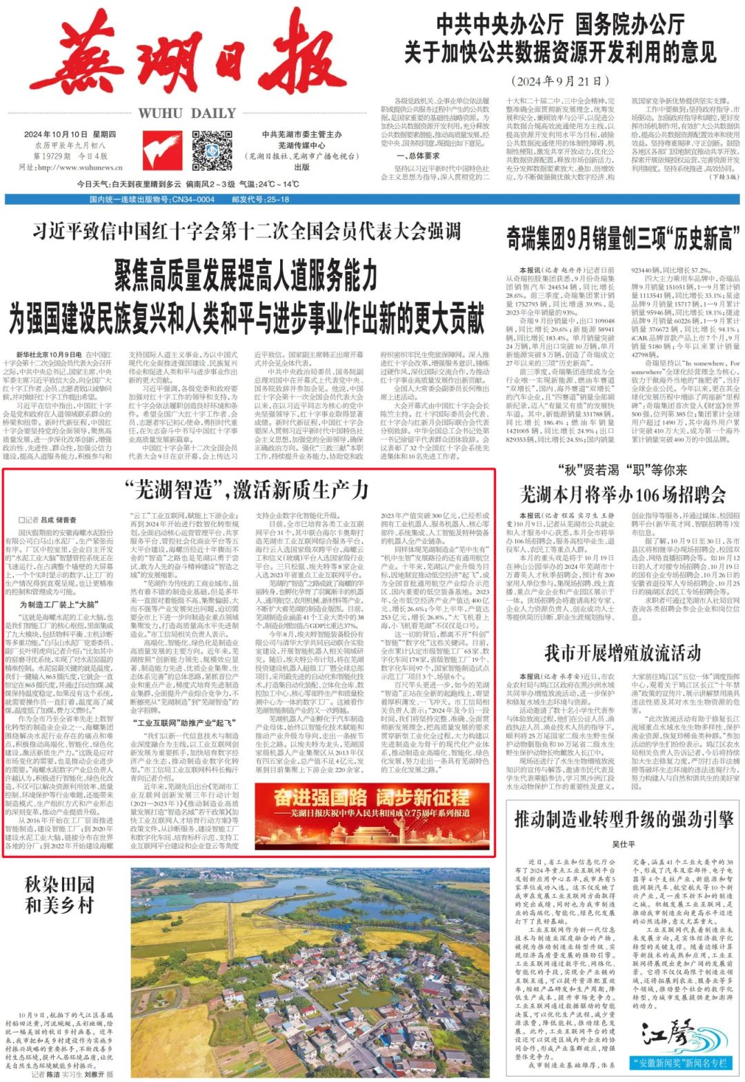 10月10日,芜湖日报头版刊发《“芜湖智造”,激活新质生产力》一文,详细报道海螺集团推动高端化、智能化、绿色化建设情况,一起来看。