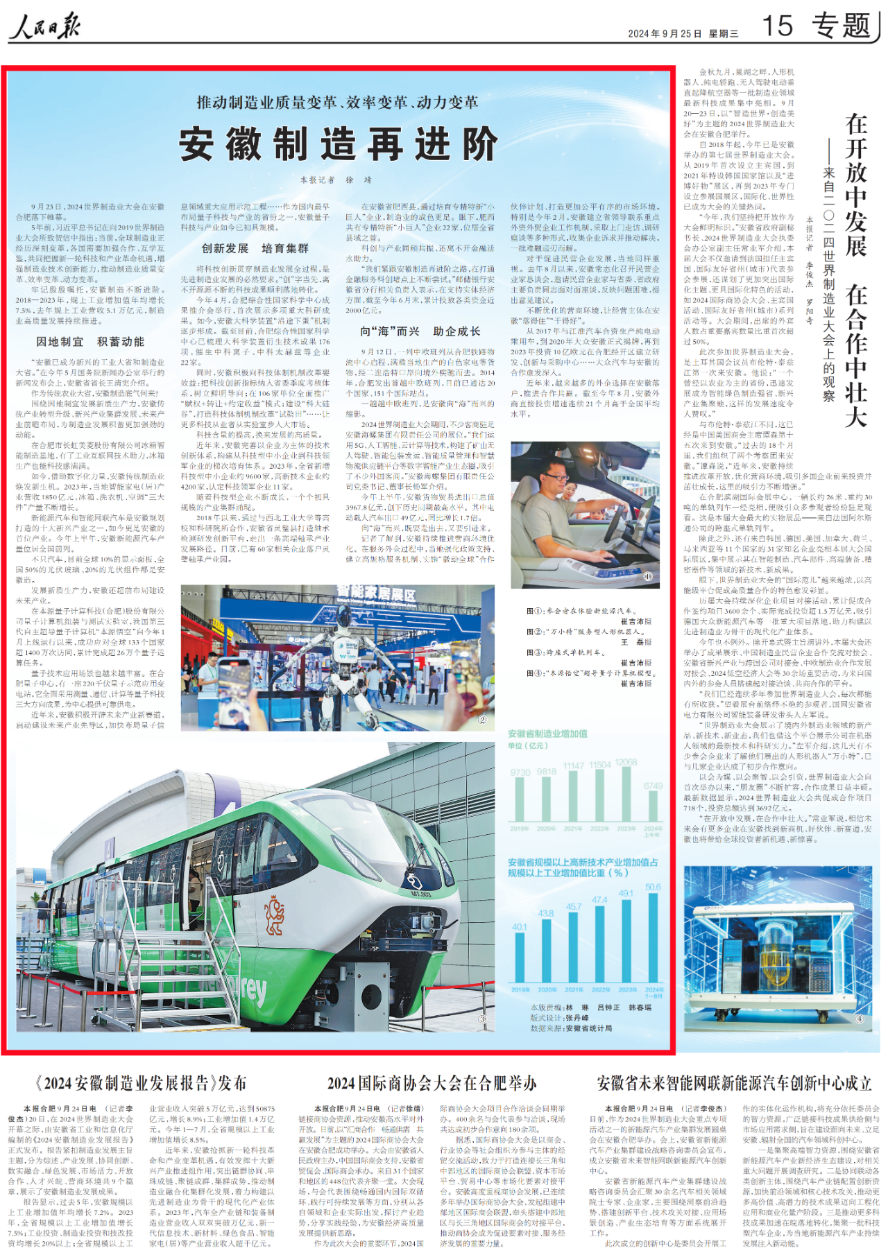 近日,《人民日报》刊发文章《推动制造业质量变革、效率变革、动力变革,安徽制造再进阶》,报道海螺集团推动产业转型升级、参展2024世界制造业大会有关信息。