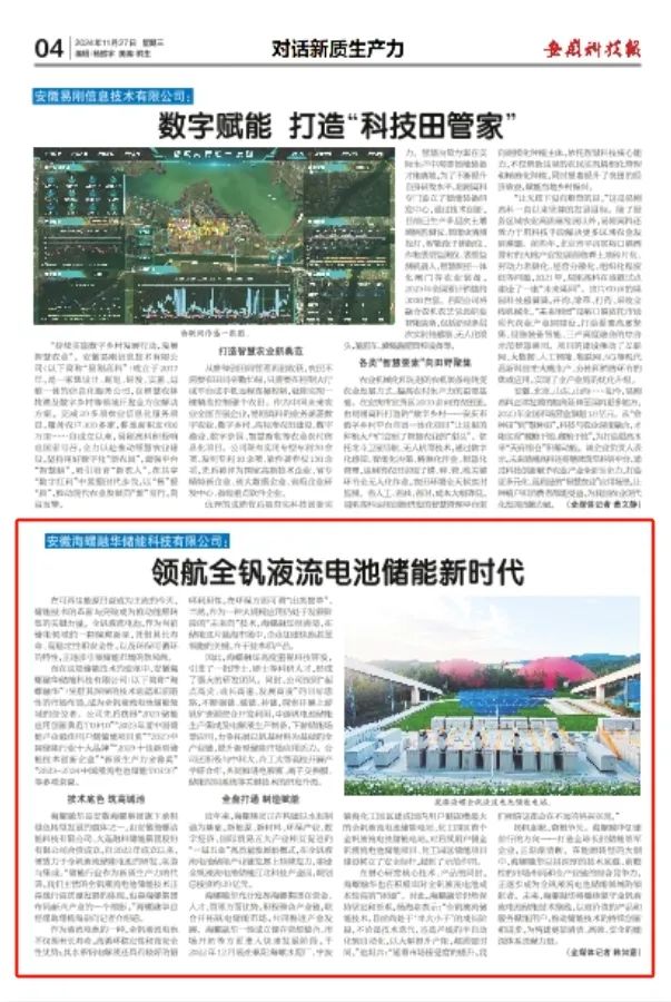 当前,新型储能作为新质生产力代表已受到广泛关注。致力于全钒液流储能电池的研发、制造与集成的海螺融华日前接受了《安徽科技报》记者采访,详细介绍公司在技术创新、产业链整合等方面的举措,一起来看全文报道。