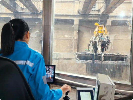 8月15日,在重庆海螺水泥有限责任公司,工作人员在操作机械臂进行垃圾处理作业。新华社记者 唐奕 摄
