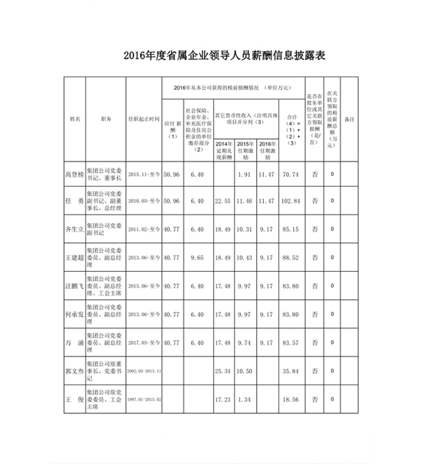 2016年度省属企业领导人员薪酬信息披露