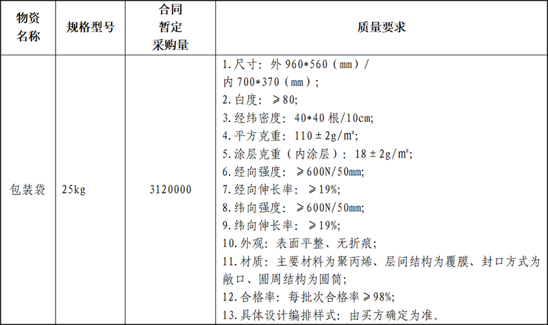 7、需具备全国包装标准化技术委员会袋分技术委员授予的包装袋生产定点企业证书(类别不限)。